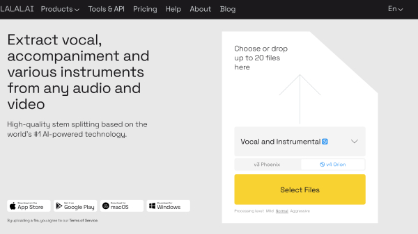 Meet Lalal.ai, a groundbreaking AI tool offering state-of-the-art audio processing capabilities like separating vocals and instrument tracks from any audio file, be it a song, video audio, podcast and more. A combination of the latest machine learning algorithms and over 20,000 hours of handpicked data allows Lalal.ai to deliver precise, sharp and high-quality audio outputs. Whether you're an audiophile, a DJ or a content creator, bid goodbye to hours of manual post-production work. With Lalal.ai, splitting tracks has become as easy as pie!
